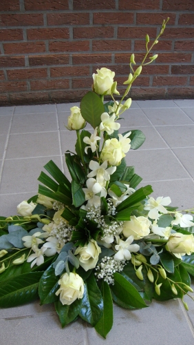 witte dendrobium Bekijk meer productgroepen in de categorie Rouwarrangementen groene anthuriums grafstukken phalaenopsis aspedistra blad kruisvorm hartvorm bakje in hartvorm oasis hartje wit/roze