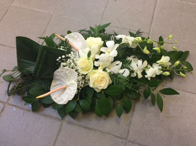 witte dendrobium Bekijk meer productgroepen in de categorie Allerheiligen witte anthuriums gele conny's rose lelie's platte grijze schaal rieten bakje