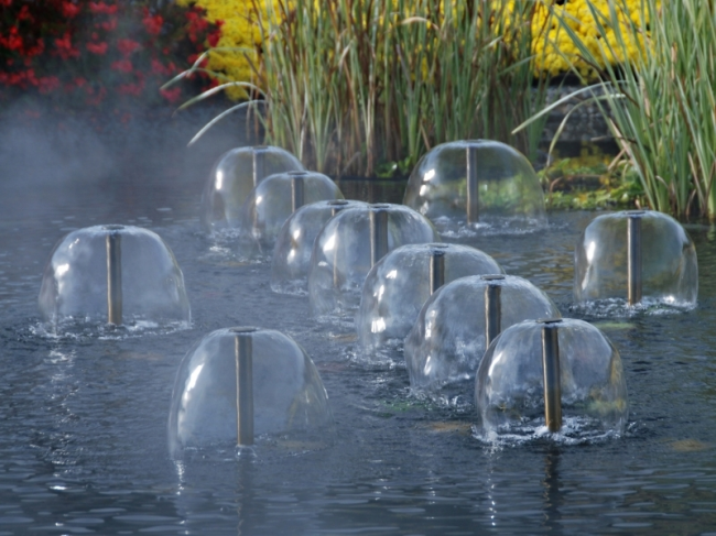 Afhankelijk van de groottte van de vijver kiest u een pomp. In eerste instantie wordt een pomp aangeschaft om het vijverwater in beweging te houden maar ze kunnen ook worden gebruikt voor watervalletjes, een fontein aan te sluiten of het water naar de filter te pompen. Voor een fontein is het belangrijk te bepalen hoe hoog de pomp het water kan oppompen en het aantal liters dat hij per minuut kan verpompen. Voor een fonteinstraal van 50 cm is een pomp met een capaciteit van 30/40 liter per minuut geschikt. Speciale kopstukken geven een extra dimensie aan de fontein.