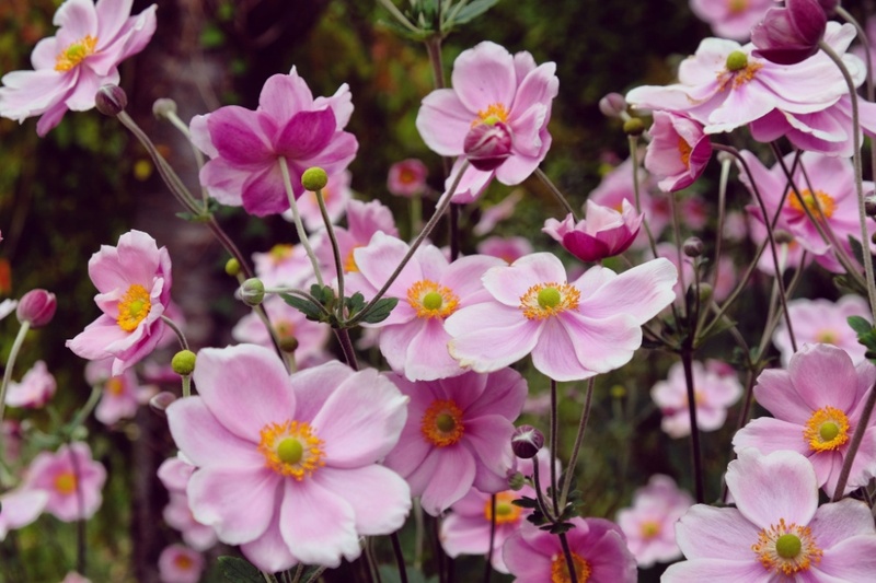 De Japanse anemoon krijgt lange, redelijk stevige stelen met elegante witte of roze bloemen en bloeit eindeloos lang, in zon of halfschaduw.