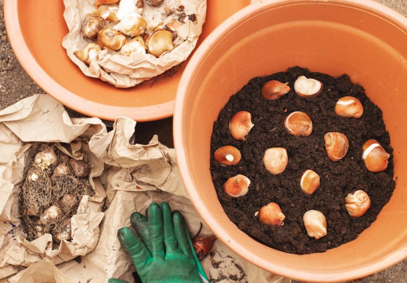 Bollen houden niet van nattigheid, dus neem een grote, vorstbestendige pot met een gat of meerdere kleine gaten in de bodem. Leg wat scherven van een terracottapot onderin en voeg vervolgens een laag hydrokorrels van circa 2 tot 3 centimeter toe. Meng verse potgrond met zand, zodat de grond minder lang vocht vasthoudt (voorjaarsbollen houden niet van nattigheid en kunnen dan gaan rotten) en vul de helft van de pot daarmee.